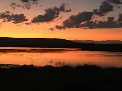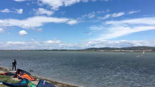 The narrow beach where we set up the kites is downwind from the parking lot (with N-W winds). It is therefore recommended to walk a few meters into the water to launch safely. The "beach" on the edge of the lagoon is not very wide, becoming narrow or even non-existent when water levels are high. It is recommended to launch in the water (by walking into the lagoon to move away from the parking lot). Do not navigate between the small island directly in front of the parking lot and the shore to keep the launching and landing area clear.