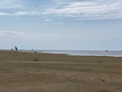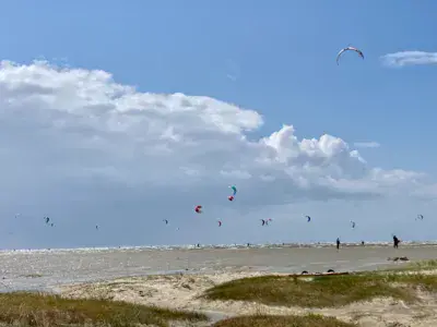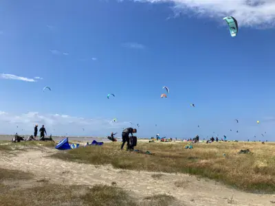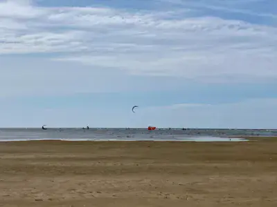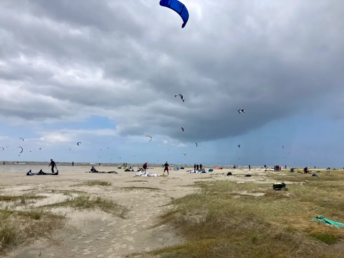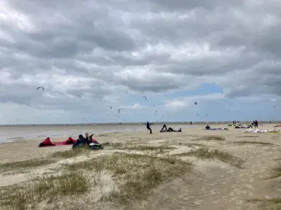Spot de Kitesurf dans la mer du Nord. Immense plage. Il n y a pas de délimitation pour le Kite sauf l interdiction de navigation dans la zone baigneur. La cohabitation se fait avec les baigneurs, les cavaliers, les plagistes, les chiens, ....mais il y a bien assez de place ! Il faut parfois marcher (beaucoup) pour atteindre la mer qui se retire (marées).